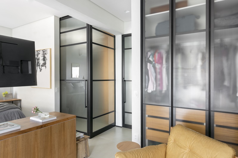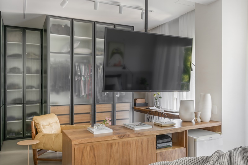 Na área social foi usado piso de porcelanato com uma textura de pedra, madeira (freijó), preto (nos perfis metálicos, escada e objetos pontuais) e leves pitadas de cor, salpicadas por todos os ambientes. A escada, existente, foi pintada de preto para dar um ar mais moderno. Na sala de TV, o banco em marcenaria segue o desenho da escada helicoidal e quebra a ortogonalidade da marcenaria e do mobiliário. “Ele exerce uma função estética e funcional, pois também pode ser usado como assento tanto para quem está interagindo com a sala de TV quanto com a varanda”, explica a arquiteta.