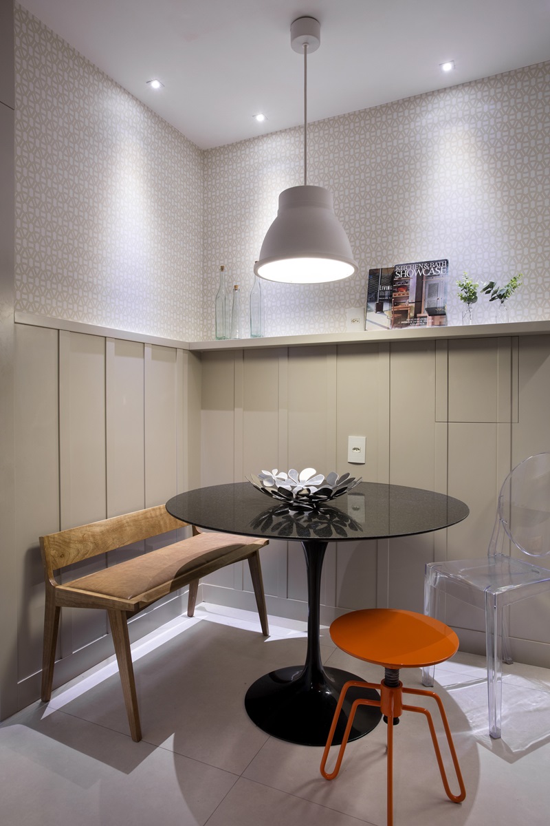 Os moradores, um casal de advogados em torno de 45 anos, com uma filha de 7 anos, queriam uma atualização dos interiores, sem reformas radicais, mas que tornasse os ambientes mais leves. Tons claros com toques de cor foram utilizados para contrabalançar o piso existente em madeira escura e deixar a decoração elegante e alegre.