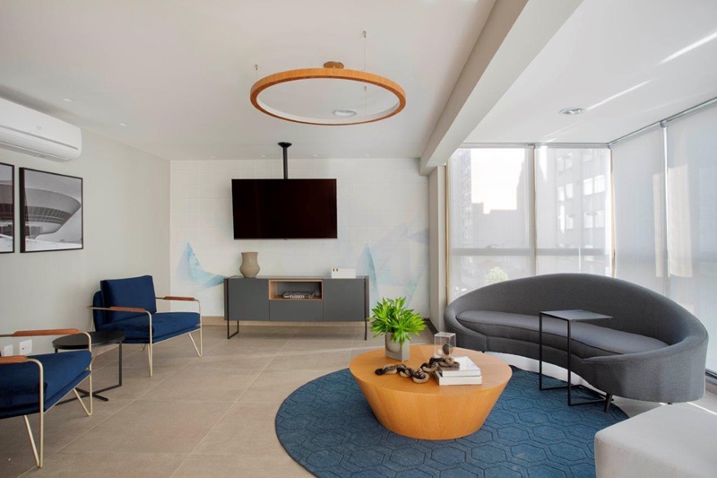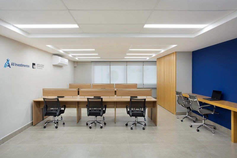 Mesmo com a pandemia, a área total da All Investimentos foi mantida, mas somente metade do mobiliário funcional previsto no projeto original foi montado para respeitar o distanciamento mínimo entre os colaboradores. A medida gerou alguns espaços propositalmente descampados e, das 24 estações de trabalho, restaram apenas 12, com 2,4m de distância entre cadeiras e 1,6m entre mesas. Os arquitetos também desistiram da ideia de usar uma grande mesa coletiva de trabalho, totalmente sem barreiras, inserindo no meio dela vários “biombos” baixos. O distanciamento do mobiliário dos lounges e salas de espera também aumentou e algumas peças chegaram, inclusive, a ser eliminadas. “Tudo isso porque a All optou pelo esquema de rodízios da maioria dos funcionários para evitar aglomeração no ambiente de trabalho, e home office permanente para alguns casos”, explica Livia.