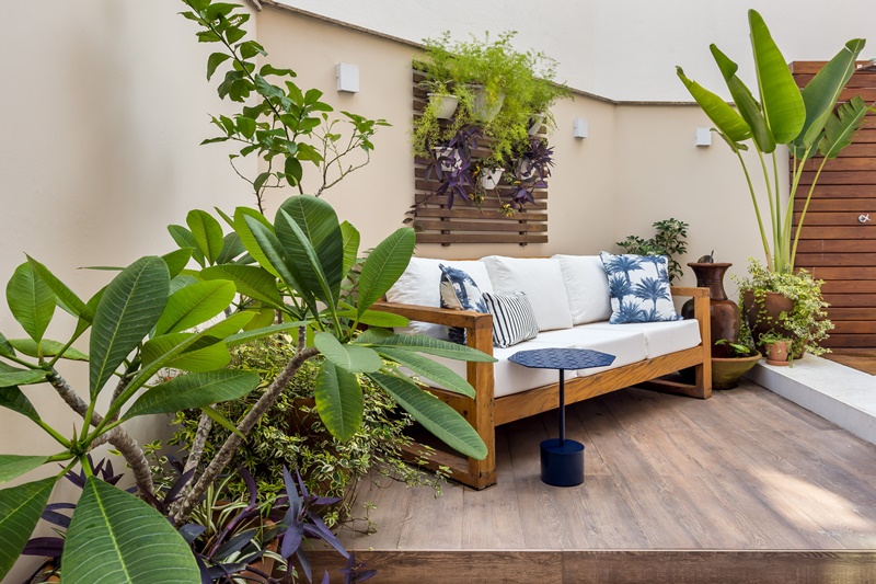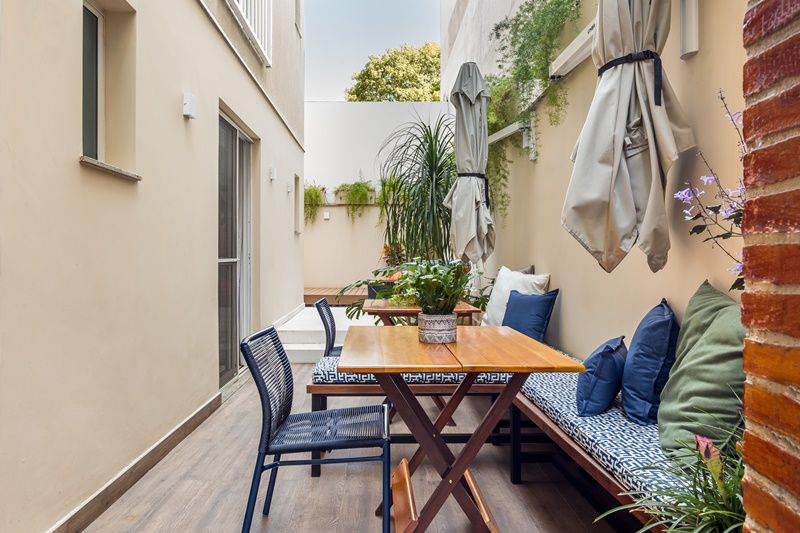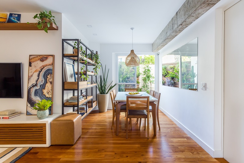 Para fazer esse projeto, as arquitetas “abraçaram” os gostos dos clientes – que amam praia/mar mas também se interessam pelo estilo industrial – e aliaram esses dois lados para chegar ao resultado final. Por se tratar de um apartamento de andar térreo com bastante espaço na área externa, as arquitetas buscaram soluções para deixá-lo com clima de casa, cuidando, especialmente, para que todas as portas e janelas tivessem vista para o novo paisagismo, como se o lado de fora fosse o quintal de uma casa.