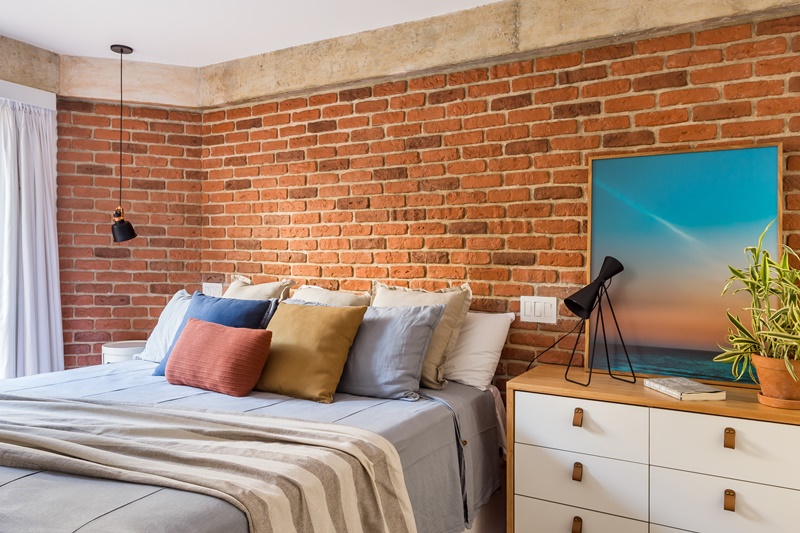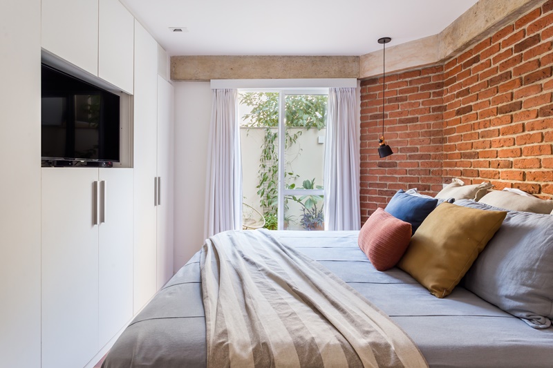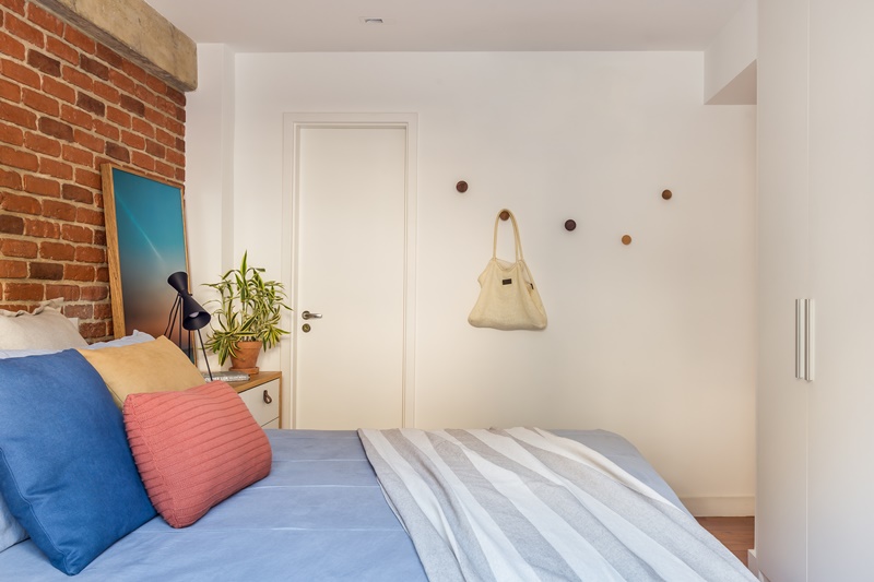 Nos quartos, as arquitetas projetaram marcenarias específicas, de acordo com as necessidades dos clientes; no quarto do casal, em particular, a parede revestida em tijolinhos trouxe mais vida ao ambiente, que também ganhou decoração nova.