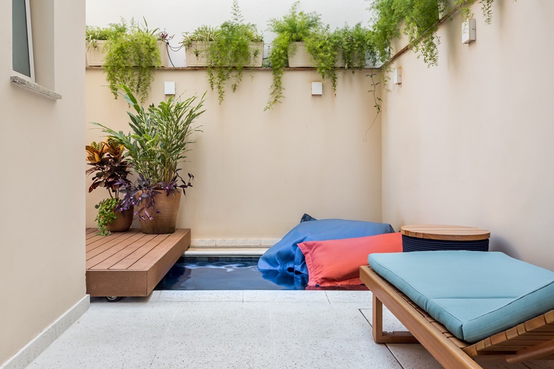 Na área externa havia pouca vegetação e a iluminação era inadequada. Grande parte dessa área externa não era usada pelos moradores, exceto a piscina e a churrasqueira. As arquitetas modificaram o layout e investiram em novos mobiliários para setorizar os usos da área (que é muito extensa e estava subutilizada) em: espaço zen, espaço de estar/refeições e espaço da piscina. Agora, a família consegue aproveitar cada m2 do lado de fora.