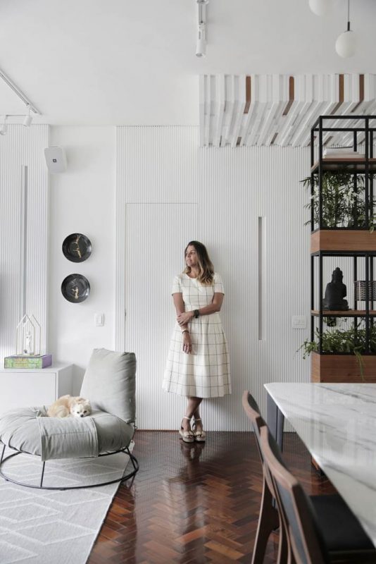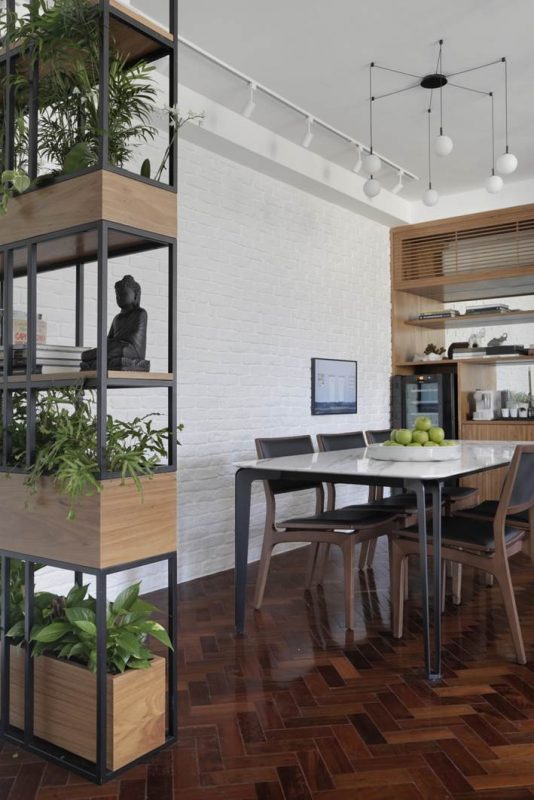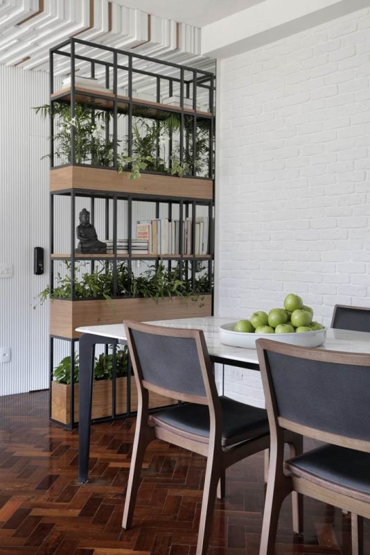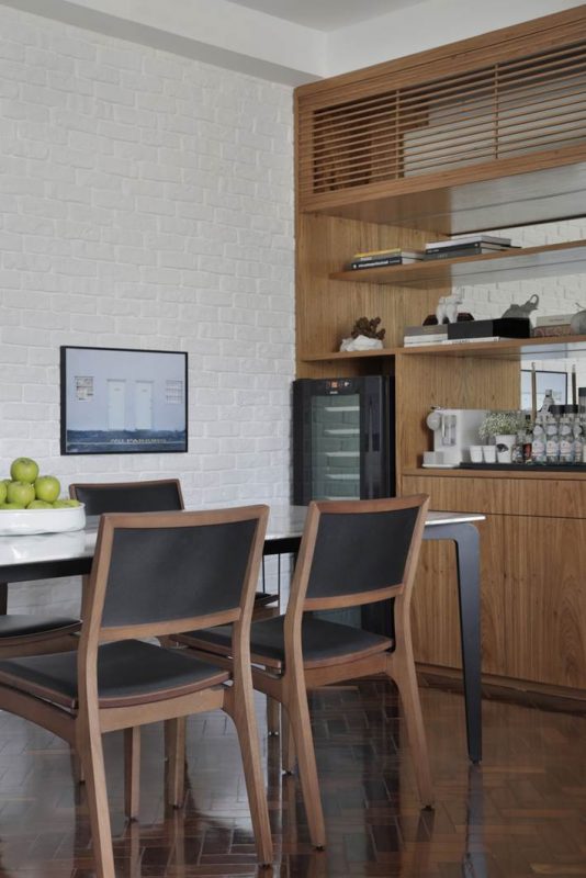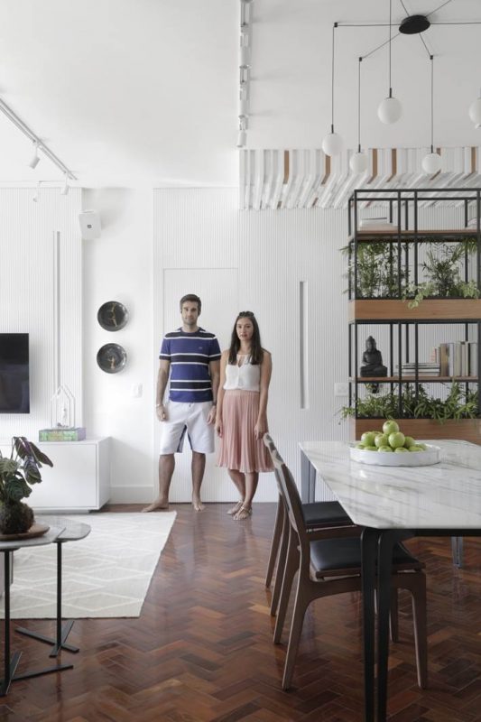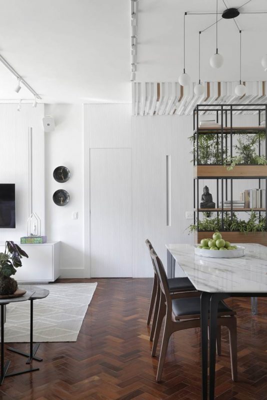O piso de tacos de madeira, nas áreas íntima e social, foi recuperado e recebeu aplicação de sinteco. Nas paredes da sala, predomina a cor branca, mas em diferentes texturas: atrás da mesa de jantar, no revestimento de tijolinhos já existente antes da reforma; no corredor, no painel ripado que esconde a porta de entrada e o acesso à cozinha. A estante vazada, além de acolher as plantas e livros dos moradores, também cumpre o papel de dar privacidade à área de jantar, que fica em frente à porta. Já a sala de TV é delimitada pelo uso do tapete, criando visualmente uma distinção entre as funções do cômodo.