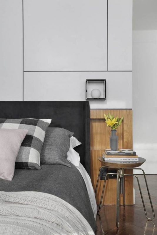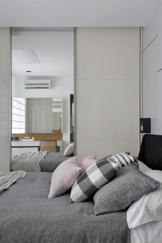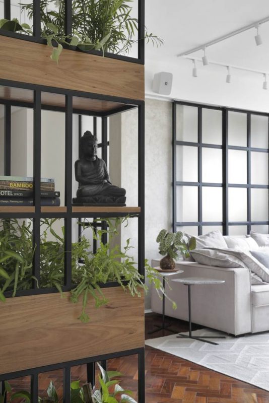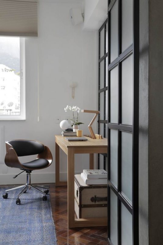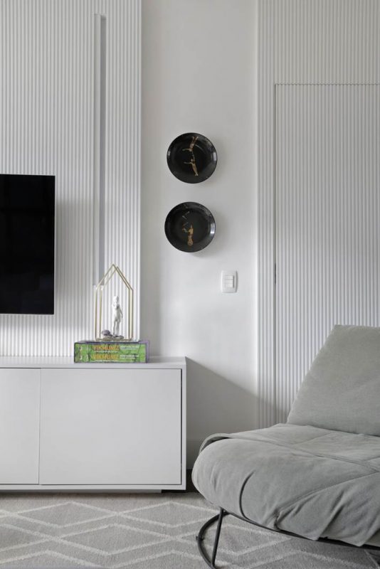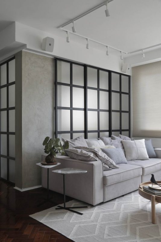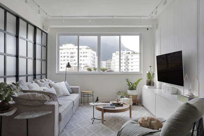 A reforma foi pontual e contemplou a demolição do gesso para elevação do teto e a abertura de um cômodo usado como escritório e quarto de hóspedes para a sala, ampliando a área social. O único imprevisto durante as obras foi a descoberta de uma coluna, incorporada ao projeto. As paredes derrubadas foram substituídas por portas de correr com esquadrias pretas, modelo que está em alta devido ao estilo industrial. “Quando necessário, o casal pode isolar ou integrar os cômodos, conforme a conveniência. No quarto de hóspedes, optamos por um sofá-cama, que pode tanto acomodar as visitas para dormir quanto ampliar a quantidade de assentos, em ocasiões festivas”, explica a arquiteta.