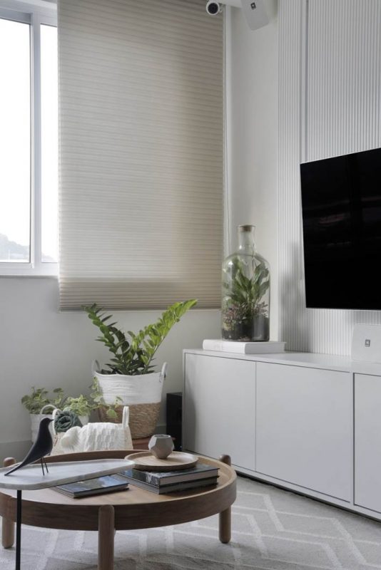 Banhado por luz natural, o imóvel de 120m² passou ao longo de quatro meses pelo projeto de reforma e decoração, adequando a nova morada ao gosto e necessidades de ambos. “O pedido da dupla foi por um projeto acolhedor, funcional, despretensioso e jovial, com muito verde. Para isso, apostei em uma paleta de cores neutra, com muito branco, preto e tons amadeirados, deixando o toque de cor por conta das plantas e acessórios”, conta Bianca.
