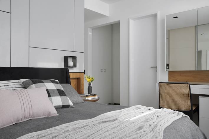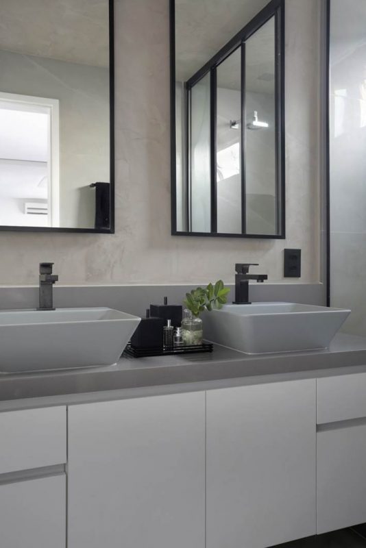 O quarto do casal, com 20m², mantem a paleta de cores da sala, com painel geométrico em laca e meia-parede em madeira na cabeceira, além do closet e penteadeira. Já o banheiro da suíte ganhou textura de cimento queimado nas paredes e metais pretos para a dupla de cubas, reforçando o toque industrial dado à morada.