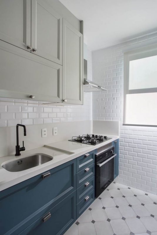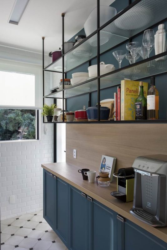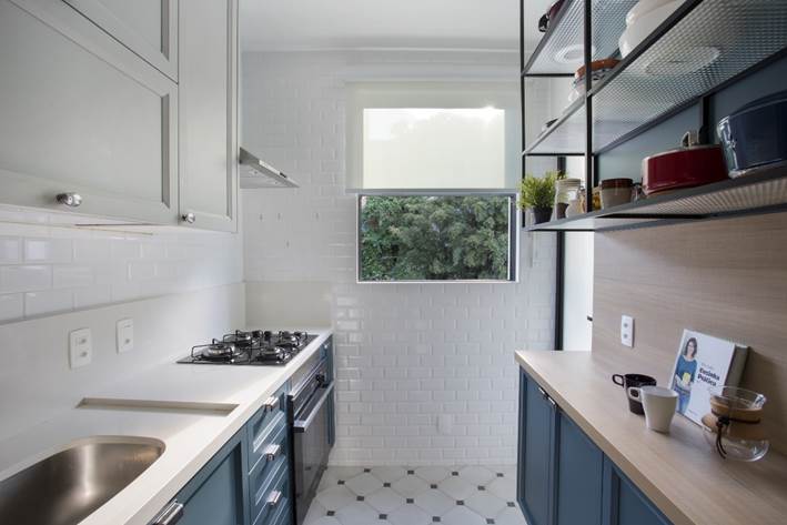 Na cozinha, o perfume é retrô: azulejos tipo metrô, na cor branca, cobrem as paredes, enquanto para o piso foi escolhido um porcelanato que remete ao ladrilho hidráulico. Os armários da linha bistrô ganharam duas cores: off white e azul-petróleo, com puxadores vintage, de um lado, e uma estante aérea vazada do outro, em serralheria, com a parede ao fundo pintada no mesmo tom azul dos armários. Logo abaixo, um painel amadeirado acolhe eletrodomésticos de pequeno porte e pode ser usado como apoio para refeições rápidas. “É um apartamento com a cara dos moradores: jovem, prático, aconchegante e ideal para começar a vida a dois”, conclui a arquiteta.