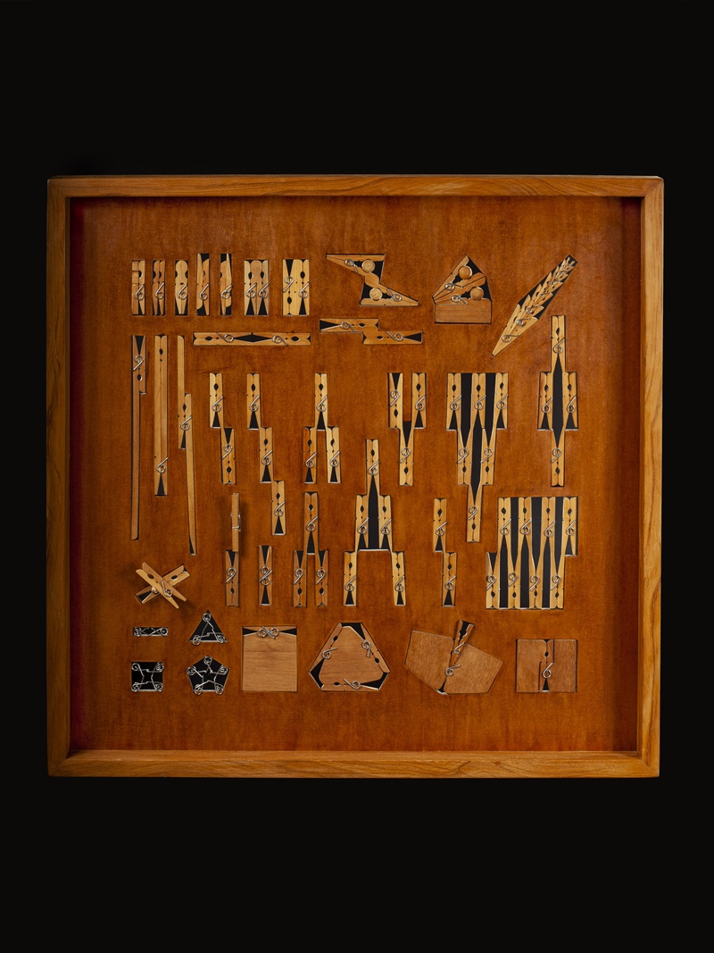 Intitulada “Cadeias Elementares”, esta primeira mostra do artista compreende quase 30 trabalhos, todos inéditos, e todos derivados das relações e desdobramentos do pregador de roupa, nos quais todas as peças empregam a musculatura da mola do pregador para chegar a novas articulações que poderiam estar catalogadas na gaveta das “inutilidades funcionais”.
