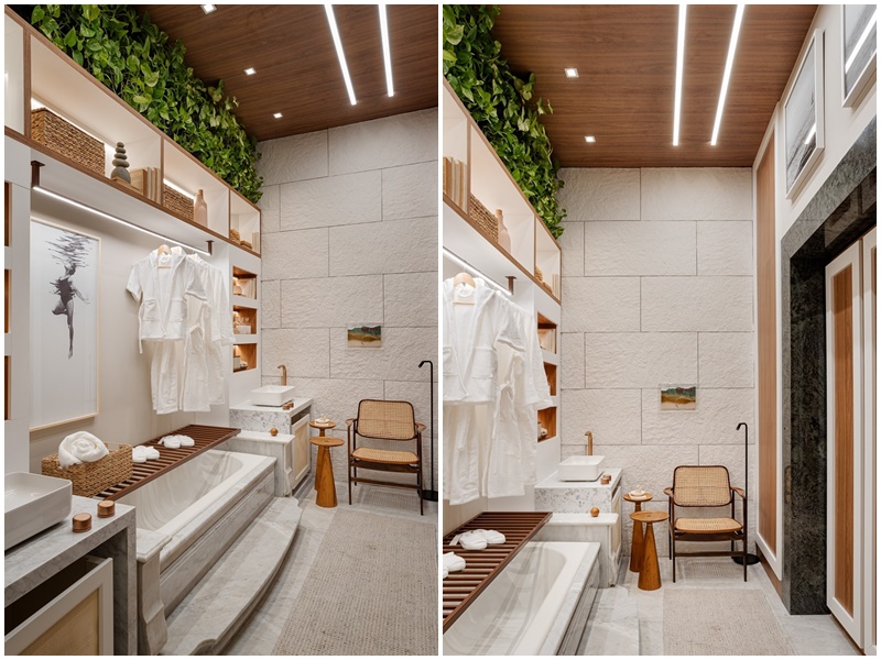 Na parte da rouparia, o mesmo cimentício é usado, criando unidade entre os dois ambientes. Contudo, um detalhe ganha destaque: um jardim vertical que traz frescor ao projeto. Conciliados a esses elementos, há também a presença forte de pedras naturais, como mármore carrara e quartzito esmeralda.
