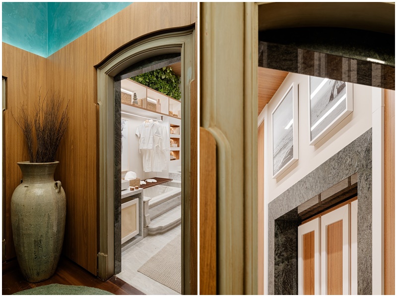 Rafael pontua, também, a forma como o olhar contemporâneo do projeto se funde, de forma harmoniosa, ao clássico do palacete em que acontece a mostra. “Da escolha da tonalidade da madeira e pendentes do hall às fotos usadas na rouparia, tudo foi pensado para criar um equilíbrio entre o novo e o vintage, preservando a história do local e trazendo uma atmosfera nova”.