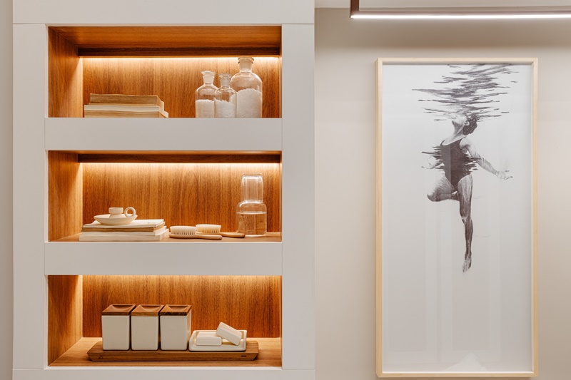 “Em tese, rouparias tendem a ser simplesmente funcionais, mas, para o nosso ambiente, criamos um conceito mais acolhedor e convidativo”, explica. “Usamos telas com registros feitos por Felipe Alvarez e Ari Kaye e a icônica poltrona Oscar, criação de Sérgio Rodrigues. Esses elementos, juntamente a detalhes ricos e elementos nobres, criam um novo conceito para esse tipo de ambiente”, finaliza Rafael.