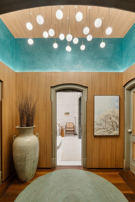 No hall que dá acesso aos quartos, a ideia foi projetar um ambiente em destaque, mas que fosse uma transição do salão da escada para os aposentos. “Como em todos os meus projetos, o uso de elementos naturais é muito presente aqui, mas com a ideia de serem neutros”, explica Rafael. Nesse caso, o uso da madeira, revestimento cimentício e pintura com efeito velvet são os responsáveis por trazer essa atmosfera natural.