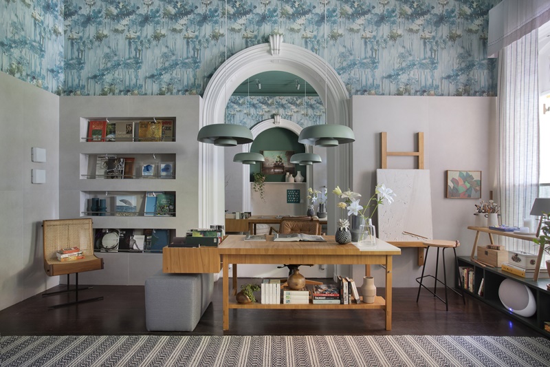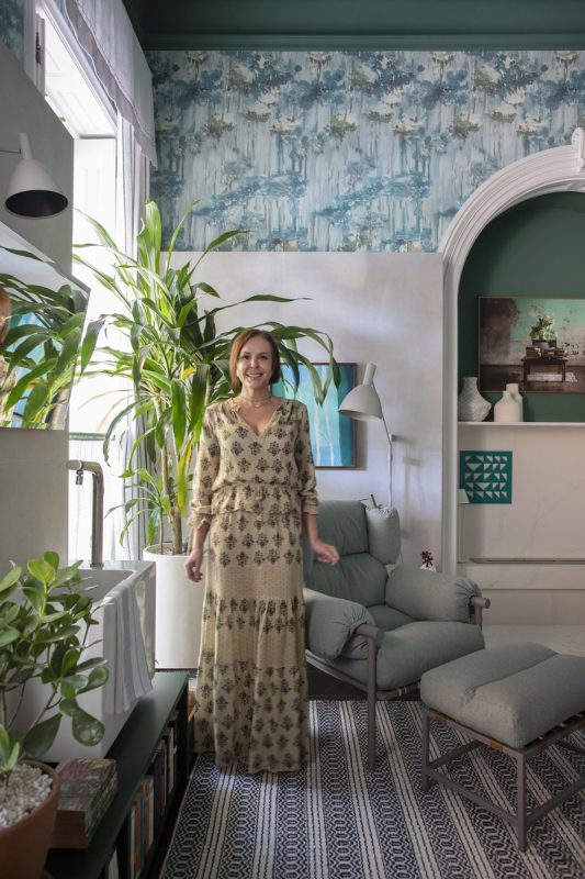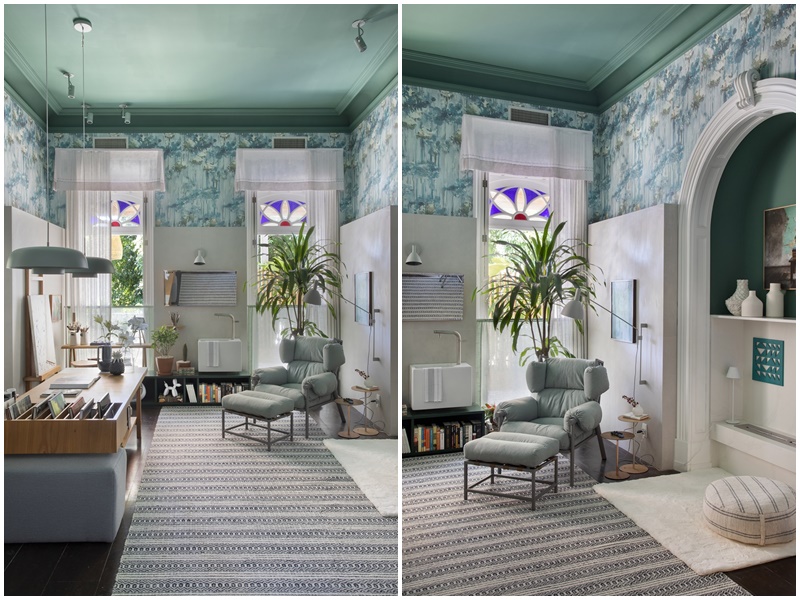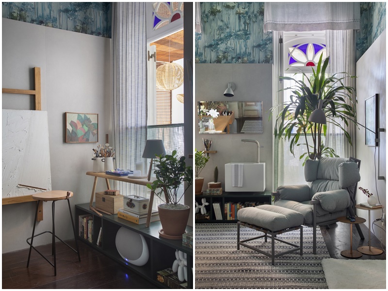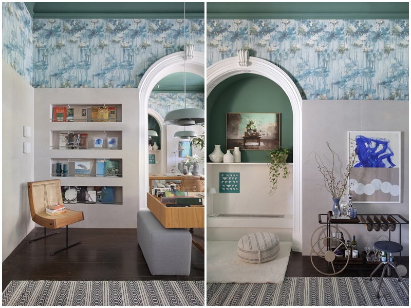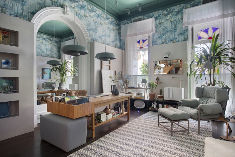 Já a decoração, predominantemente em tons de verde com toques de azul, propõe um diálogo entre os elementos clássicos da arquitetura original da casa e o presente. “Escondi as estantes antigas com uma parede revestida de porcelanato rústico com pouco mais de dois metros, que dá a volta em todo o ambiente para deixá-lo com um ar mais contemporâneo”, explica a arquiteta. Também se destacam no projeto o teto e a sanca, integralmente pintados de verde, e o papel de parede com estampa floral aquarelada, que, além de deixarem o home office mais acolhedor, trouxeram mais personalidade ao décor. “Sou avessa a modismos e tendências. Prezo pela liberdade em criar espaços funcionais mas com alma, que reflitam, acima de tudo, a personalidade e o universo particular de cada cliente”, conclui.