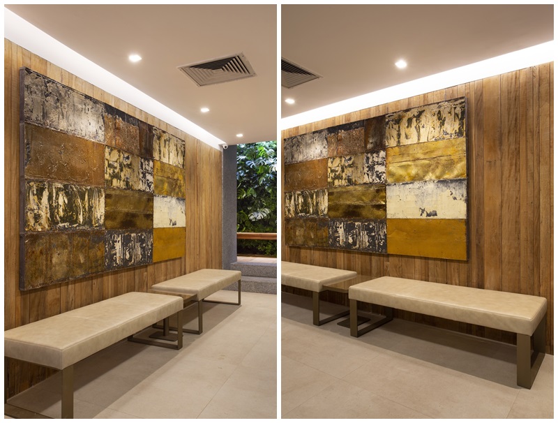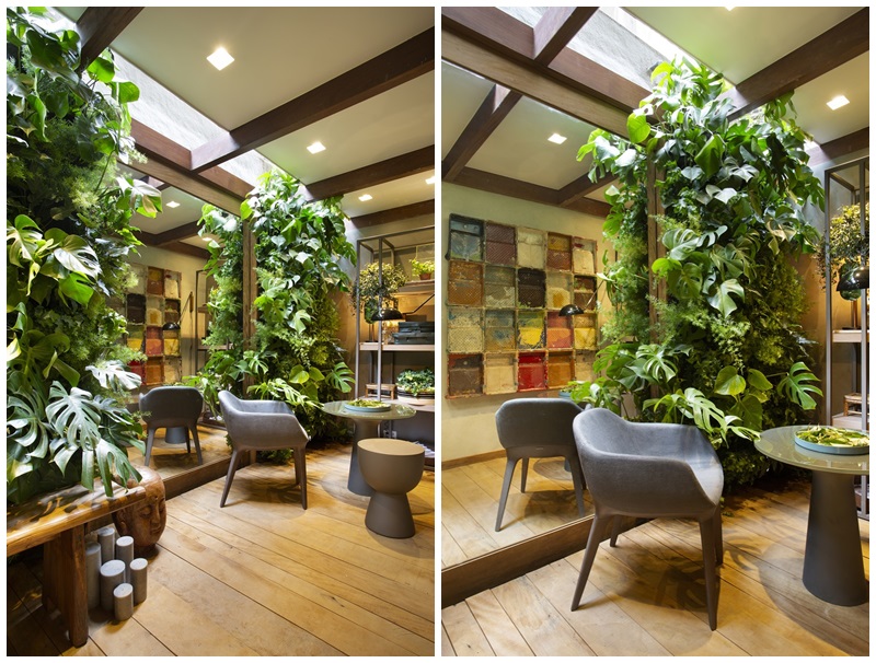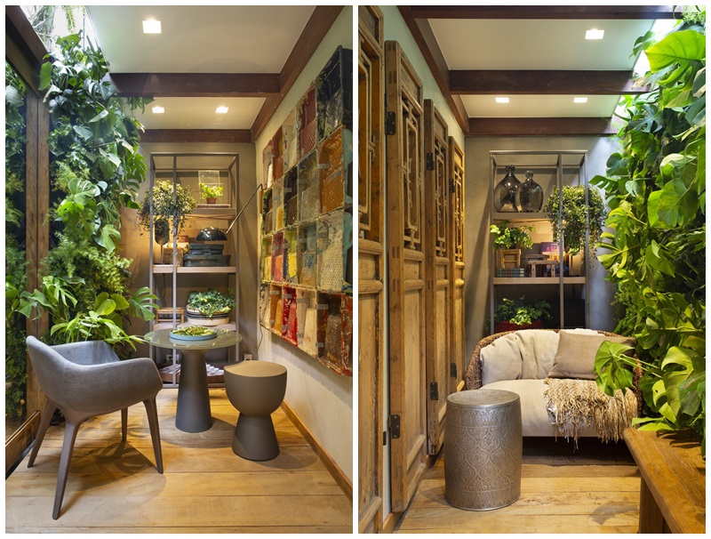 O tema da mostra esse ano, “A Casa Viva”, provocou a dupla de profissionais a usar materiais sustentáveis, naturais e reciclados, como madeiras de demolição com certificação DOF (Documento de Origem Florestal), steelframe, iluminação de led e obras de arte do artista Raimundo Rodriguez, que reutiliza materiais de descarte para criar suas peças. Como não poderia deixar de ser, os arquitetos pensaram também nas diversas formas de trazer o verde para áreas internas e empregaram todas as temáticas da horticultura indoor com o apoio da tecnologia, criando um verdadeiro Urban Jungle com temperos em vasos de hidroponia (utilizando 90% a menos de água e impedindo o desperdício), jardim vertical de plantas alimentícias não convencionais (que conta com um sistema automatizado de cuidados e irrigação, controlado por um aplicativo) e plantário (uma espécie de horta/estufa eletrônica).