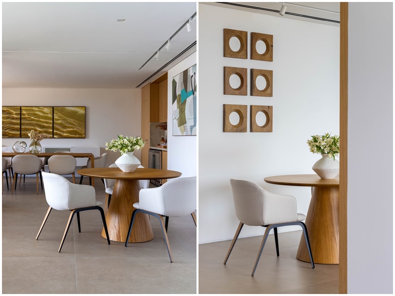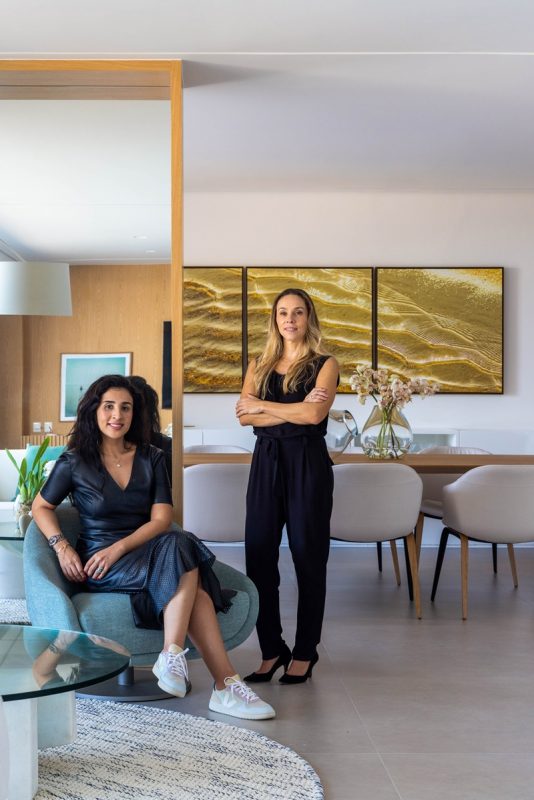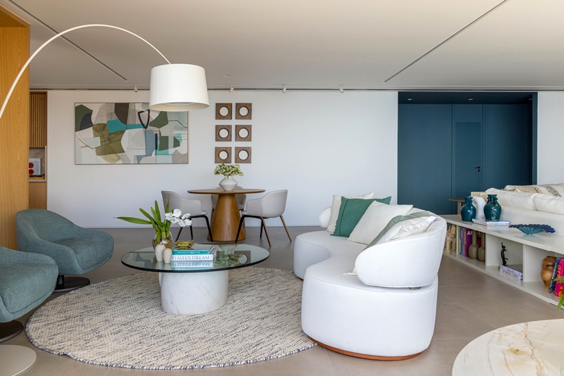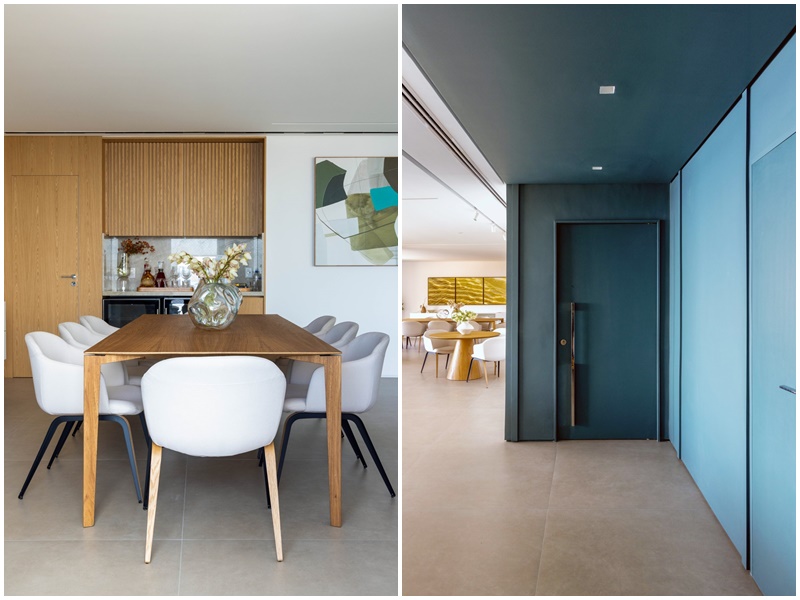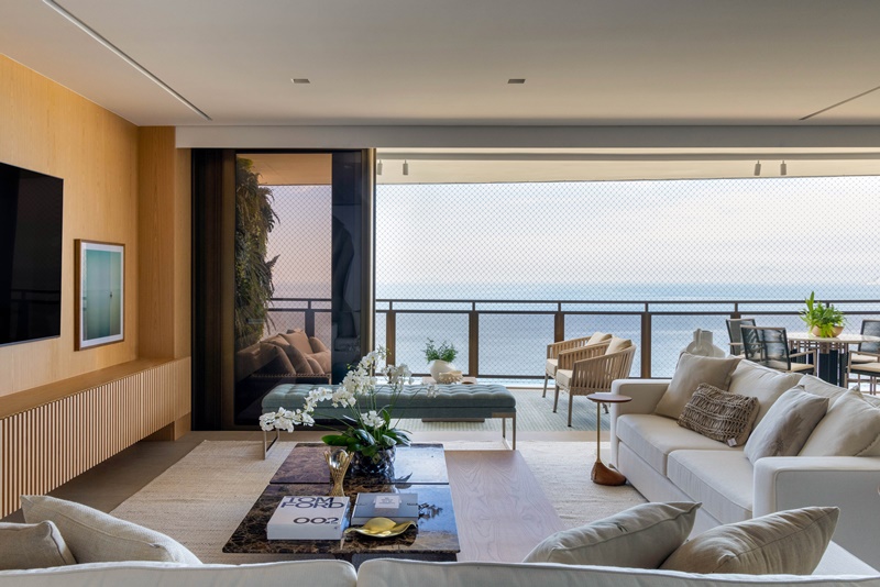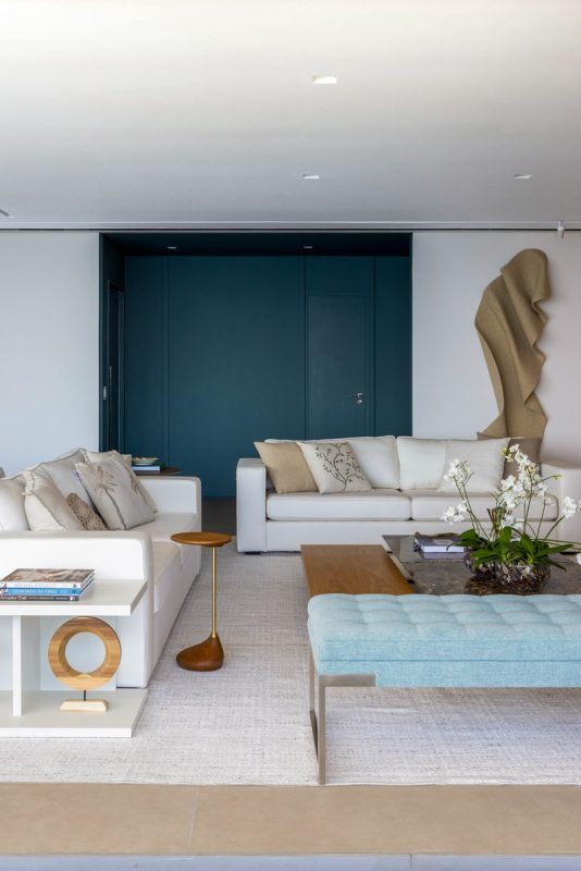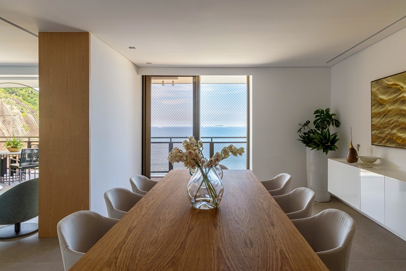 Segundo a dupla, os clientes pediram para integrar as salas de estar e jantar, criar um closet na suíte deles e um espaço com função de copa, ampliar o corredor de entrada da cozinha, e trocar o piso existente em mármore escuro, o sistema de ar condicionado e todas as esquadrias de alumínio, incluindo o guarda-corpo da varanda da sala. “Agora, é possível deixar totalmente livre o vão entre a área social e a varanda, debruçada sobre o mar“, ressalta Geize.