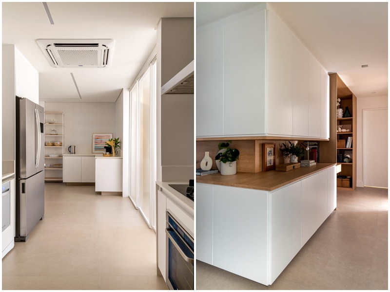 Com a reforma, uma parte do espaço antes ocupado pelas dependências de empregados foi usada não só para ampliar a largura da cozinha como também para criar uma terceira suíte que não havia na planta original. “Era importante que os dois filhos tivessem banheiro no quarto, e não apenas um, como na planta original“, informa Alessandra. Para criar o espaço da copa solicitado pelos moradores e ampliar ainda mais a cozinha, o antigo louceiro e a despensa também foram redimensionados. Por fim, o corredor íntimo ganhou novos armários e uma área subutilizada que abrigava as antigas máquinas de ar condicionado central foi transformada no “canto do Instagram” para a moradora, que é influencer digital, fazer seus vídeos e lives confortavelmente.