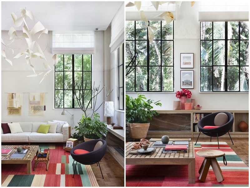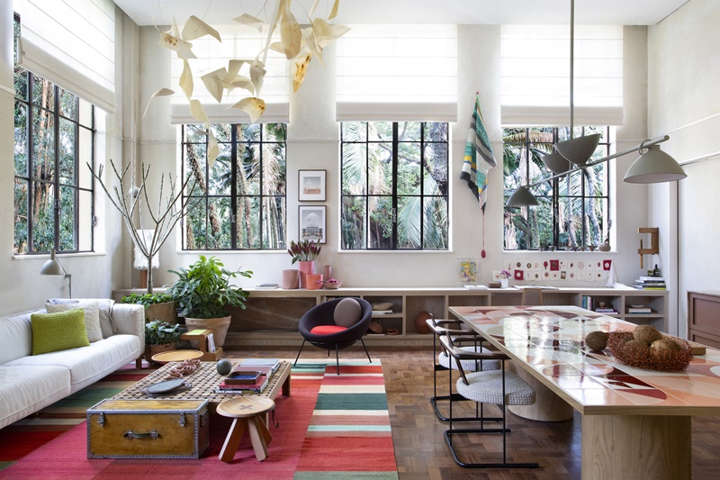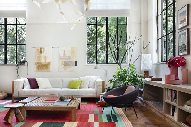 Mantendo a base da arquitetura original, o loft combina, com harmonia, cores intensas aplicadas em pontos estratégicos para trazer a sensação de calma e equilíbrio. Essa serenidade é intensificada pela conexão direta com a natureza, filtrada pelas cinco grandes janelas com cortinas translúcidas que emolduram o verde exuberante do Parque da Água Branca. “A luz natural invade os 72 m² do loft, com pé-direito de 4,5 metros, criando, ao longo do dia, um jogo poético de sombras e reflexos“, revela a arquiteta.