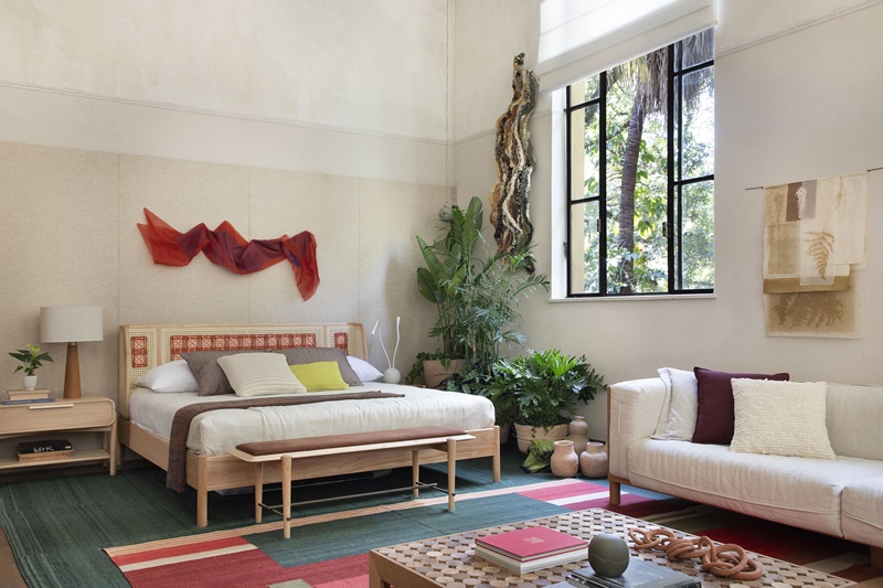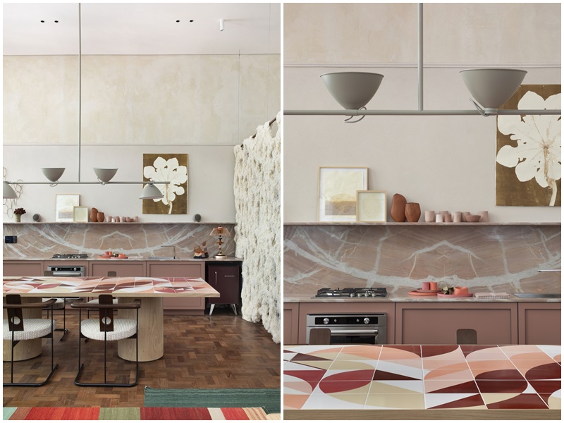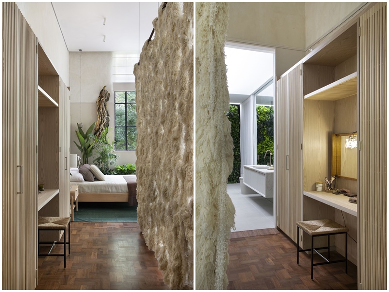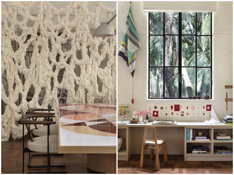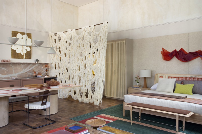 ARTE TÊXTIL. Pensado para uma mulher contemporânea, que transita entre o universo da moda e a pesquisa em arte têxtil, o Loft Alvorá traduz sua personalidade em cada escolha. “De Minas a Paris, nossa cliente imaginária garimpou peças únicas, feitas à mão, com forte valor simbólico e estético, que dão identidade ao espaço“, diz Paula. São exemplos dessa arte têxtil: os organdis de seda tingidos com a técnica japonesa shibori por Ysabel de Maisonneuve (que mantém ateliê em Paris e colabora com grifes renomadas); a arte “Brajá” do Alex Rocca, inspirado em estudos sobre culturas africanas (que adiciona camadas simbólicas e históricas à decoração); e a obra “Fragmento do tempo conquistado”, criação da artista Pat Lobo composta por retalhos de linho, feltro e algodão, com apliques em cerâmica (uma coleção poética que costura tempo, sonho e matéria). Já a designer e artista Ana Vaz, de Minas Gerais, desenvolveu exclusivamente para o espaço o painel “Feminino” — uma trama têxtil de grandes dimensões que atua como divisória suspensa entre a cozinha e o closet.