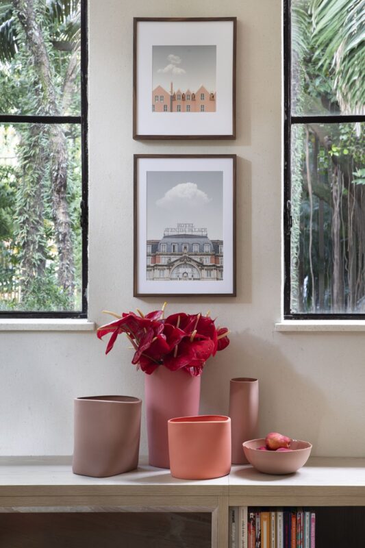 OUTRAS ARTES. A curadoria de arte também se expande por diferentes linguagens e materialidades, a exemplo da escultura suspensa “Voo das andorinhas primárias”, de Virgílio Badhe/Projeto Opõe, feita de pedaços de papel e arame; as fotografias de Leo Marino, com registros minimalistas de Lisboa, em tons delicados; as porcelanas líquidas do Estúdio Heloisa Galvão, com formas orgânicas e acabamento etéreo; as cerâmicas experimentais com formas inusitadas, do Studio Api, de Lívia Amaral; a peça de Zilah Garcia, feita inteiramente com materiais reciclados; o quadro “Pedra Riscada”, da artista Laura Villarosa, com fios, cerâmica e tinta acrílica que formam uma paisagem de tramas; e aobra da artista Bel Barcellos, denominada “Uma. Outra”, que traz o universo feminino com a força e a leveza peculiares a ele.