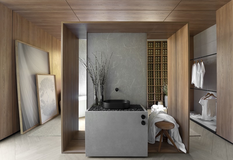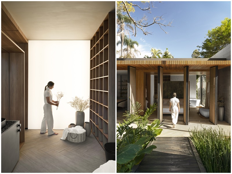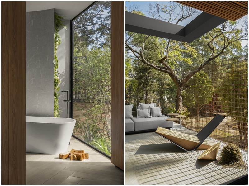 Mais reservado, o quarto, enquadrado numa estrutura de madeira, segue a linha solta com a cama direcionada para o jardim. A chaise desenhada pelo escritório é para os momentos de leitura e o painel de quartzito verde esmeralda que faz vez de cabeceira, dá privacidade ao uso do banheiro do outro lado, acompanhado de uma banheira de imersão. A iluminação delicada e sutil valoriza a volumetria, as texturas e elementos que merecem destaque.