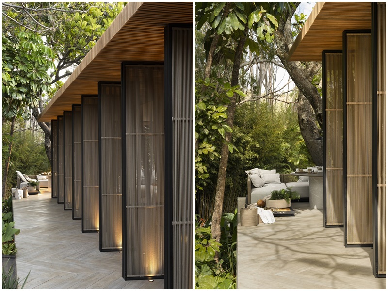 “O desenho das portas pivotantes está fazendo o maior sucesso entre visitantes. Na parte estética elas imprimem um movimento interessante na fachada, formando a volumetria, dobradas de duas em duas. Além da abertura e vedação, por conta da trama elaborada manualmente a partir das cordas náuticas, funcionam também como brises para filtrar a luz natural e proporcionar um jogo efêmero de luz e sombra”, pontua.