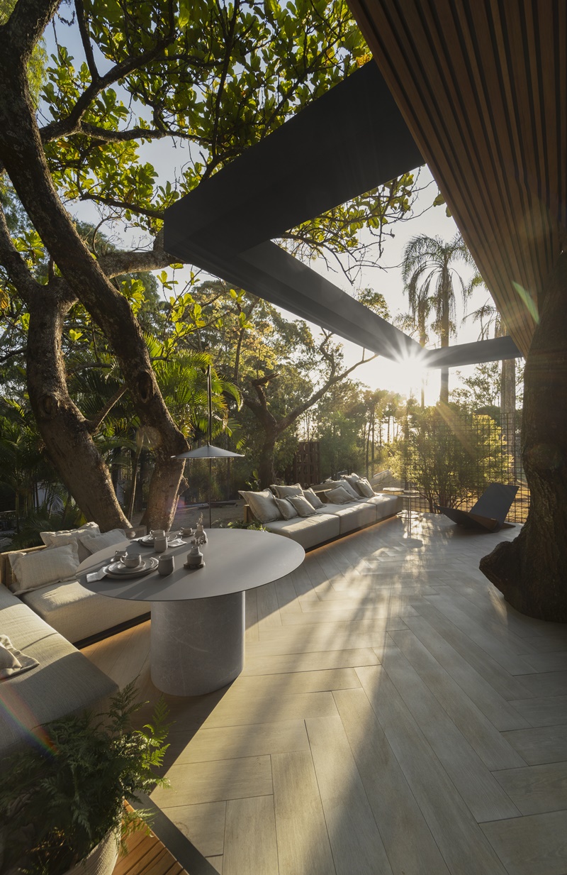 Conectada diretamente à varanda, em volta ao jardim, há um Cantinho Alemão para os cafés da manhã e ainda sofás desenhados pelo escritório intercalados às árvores para o desfrute do verde. A malha em vergalhão deixa a luz entrar livremente e a vista alcançar o belo visual em meio às araucárias e palmeiras. Assistir o pôr do sol ali é um deslumbre.