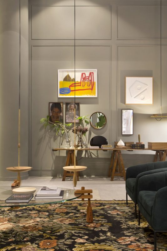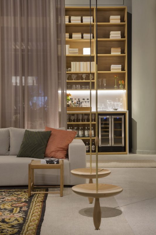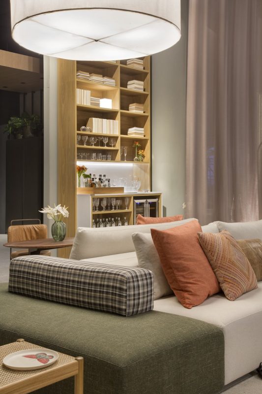 Trata-se de um grande living, com 100m², que poderia tanto ser recriado em espaços públicos, como shoppings, feiras e museus, como também reproduzido em residências. Sua concepção partiu da ideia de uma decoração que pudesse acompanhar o morador para qualquer lugar, atendendo a uma persona que é “cidadão do mundo”: itens fixos, que são deixados para trás em uma eventual mudança, como marcenaria, forros e revestimentos de parede, foram substituídos por soluções práticas – como a pintura da parede e a aplicação de uma boiserie simples – que servem como pano de fundo para contar uma história a partir do mobiliário, das obras de arte e dos objetos: “São peças que falam ao coração e podem ser levadas pelo morador para qualquer parte do mundo – seja uma luminária de piso do Jader Almeida ou taças de cristal herdadas da família”, enumera Mariana.
