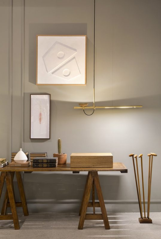 O espaço mescla diversas funções, como um canto com poltrona de leitura, mesa de trabalho e apoio para degustar bebidas, como o carrinho de chá, exposição de obras de arte e um jardim na entrada. Entre os destaques do espaço estão as peças do designer mineiro André Ferri – uma luminária pendente, um banco e um balanço. “Ele próprio produz os móveis em casa, com ferramentas que já foram usadas por seu pai e seu avô, ambos marceneiros”, conta Adriana.