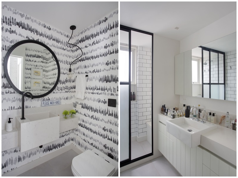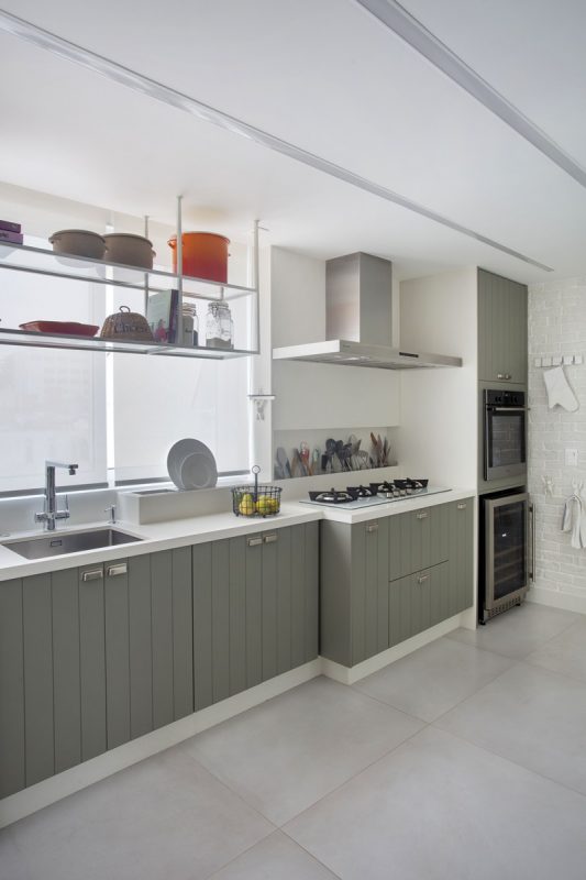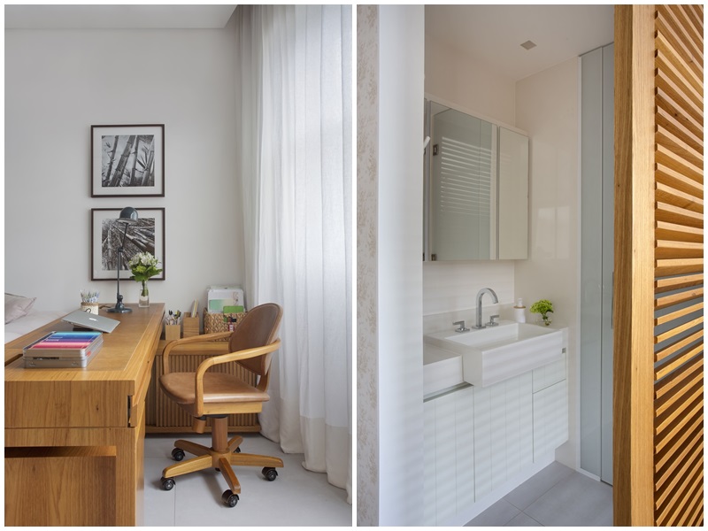 “Para transformar um banheiro em três suítes precisamos fazer um cálculo estrutural que elevou o piso do apartamento, permitindo passar as novas tubulações, exceto o piso da sala, que precisava estar nivelado com o piso do hall do elevador”, lembra a arquiteta Cecília Teixeira. “Para viabilizar o projeto sem deixar os cômodos muito apertados, a solução que encontramos foi transformar a cozinha na circulação da casa, conectando a área social e os quartos.Num primeiro momento, a ideia pareceu muito diferente, mas logo a cliente embarcou nela e adorou o resultado. A cozinha acabou se tornando o coração da casa”, acrescenta a sócia Bitty Talbot.