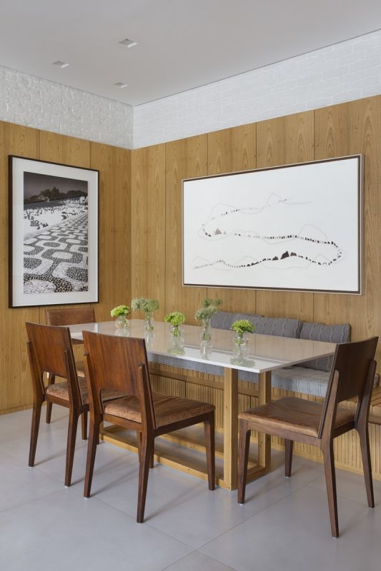 Praticamente toda a decoração do apartamento é nova. Apenas alguns móveis que a cliente já tinha foram aproveitados, como as cadeiras de jantar e algumas poltronas, além de objetos, adornos e obras de arte. A marcenaria de todo o apartamento foi desenhada pelas arquitetas.