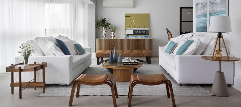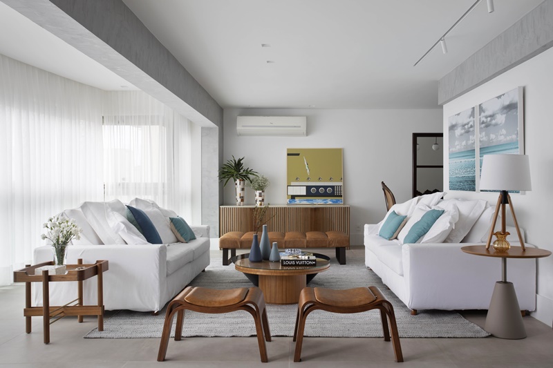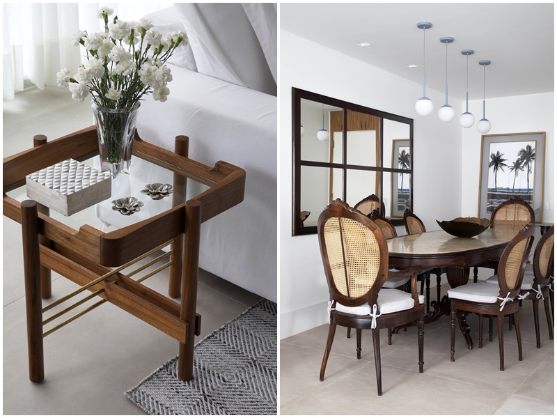 No que se refere à decoração, praticamente é tudo novo, de móveis a quadros passando por tapetes e adornos. A exceção está na sala de jantar, que foi ambientada com móveis clássicos de época, herança de família dos clientes. Toda marcenaria dos quartos e banheiros foi desenhada pela própria arquiteta e executada pela Canto de Dormir. “O projeto tem uma atmosfera leve e contemporânea que reflete a personalidade alegre dos moradores. Por isso, optei por cores claras e elementos naturais, como madeira, couro e tecidos de algodão, para conferir aconchego e pontos de cor para trazer alegria“, conta ela.