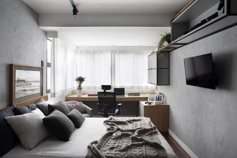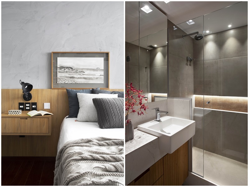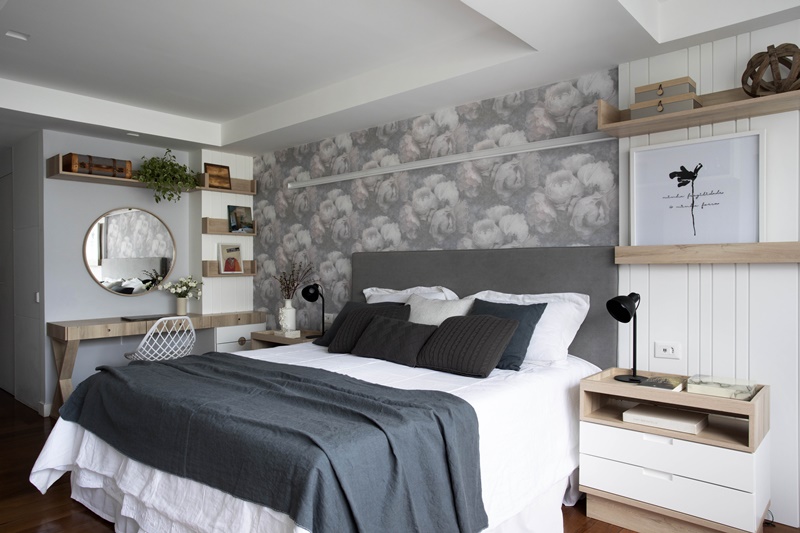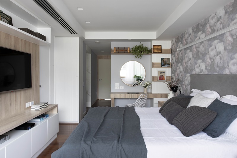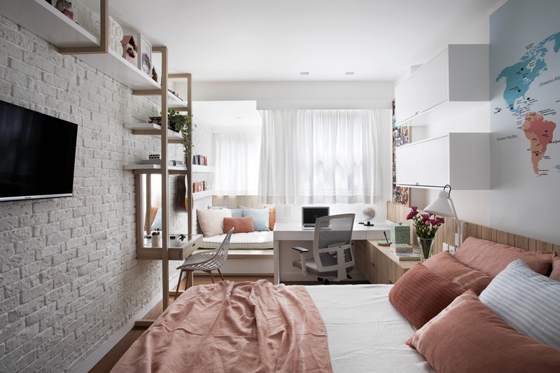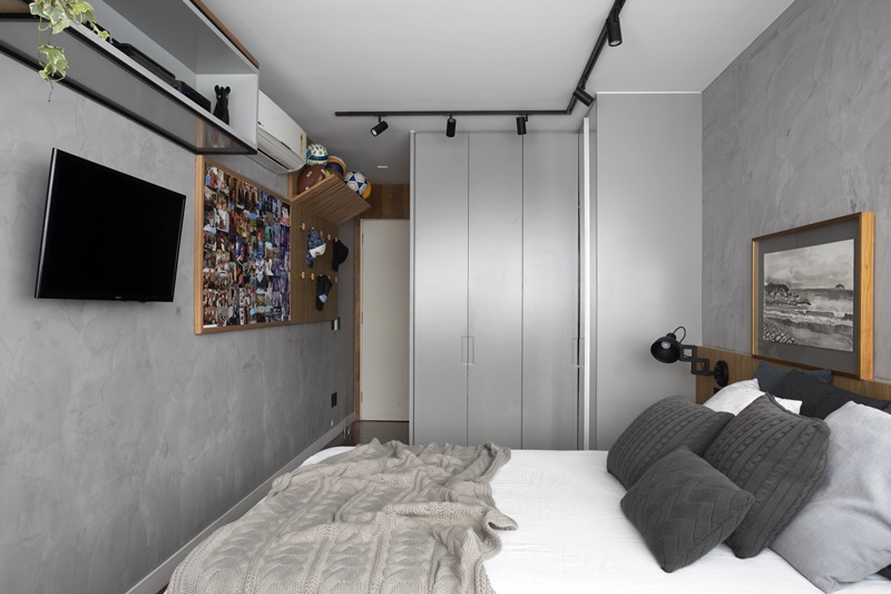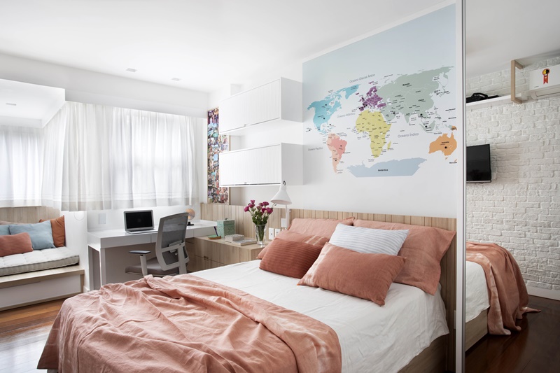 No quarto do casal, Zaccaro destaca as soluções de marcenaria, especialmente a penteadeira (que também funciona como bancada para home office) e o painel ao lado da cama, que esconde uma janela com vista para o vizinho. No quarto da filha, ela ressalta a escolha das cores do décor, que foi (a pedido da cliente) extraída do painel de mapa da parede atrás da cama. Já no quarto do filho, a decoração tem uma pegada mais industrial, a pedido dele próprio.