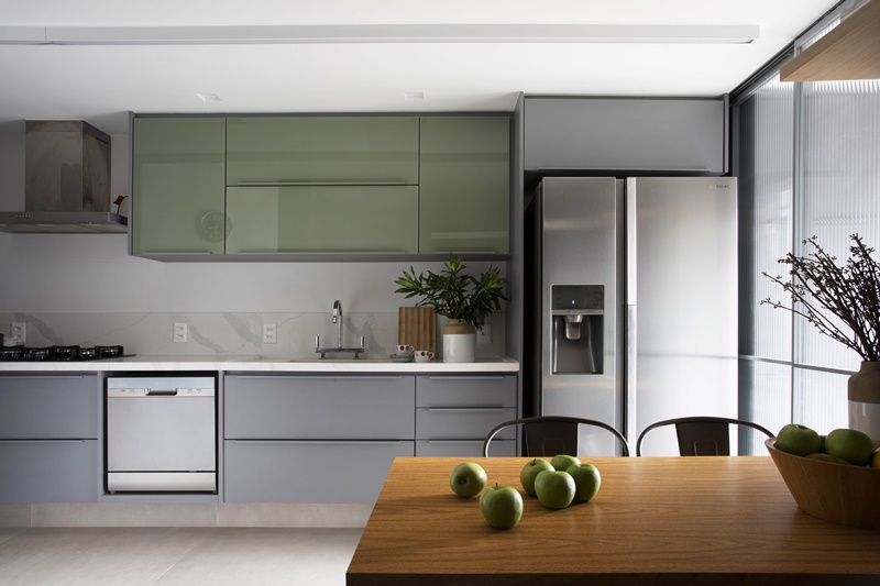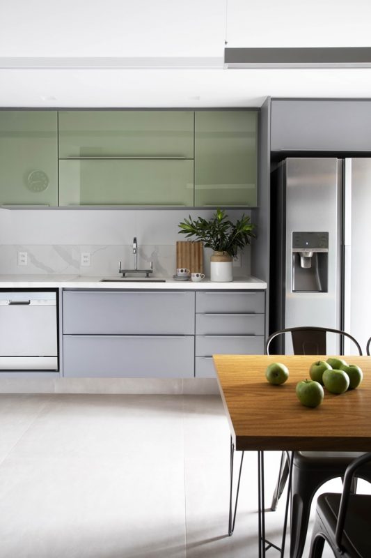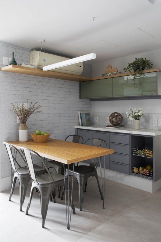 Como a cozinha tinha um tamanho generoso e formato quadrado, a arquiteta colocou a copa no centro, deixando-a bem mais confortável. “Usei madeira e tijolinho na copa para trazer aconchego e um toque de cor nos armários para deixar o espaço mais alegre. Para separar a área de serviço, usei uma porta de metalon com vidro canelado, permitindo a entrada de luz quando fechada“, explica Carmen Zaccaro.