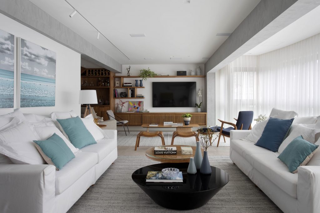 Espaços amplos, confortáveis e funcionais para receber parentes e amigos, uma suíte para cada filho no pavimento inferior e uma suíte para os pais no andar de cima. Estes eram os principais desejos de uma família composta por um casal entre 40 e 50 anos (ela, advogada; ele, engenheiro), com dois filhos (ela, 21 anos, estudante de moda; ele, 18 anos, jogador de vôlei) ao comprar uma cobertura duplex, de 250m2, no Leblon, na zona sul do Rio de Janeiro. A missão de colocar tudo em prática em apenas seis meses – já que os clientes venderam o apartamento antigo e tinham data para se mudar para o atual – coube à arquiteta Carmen Zaccaro (@carmenzaccaroarquitetura).