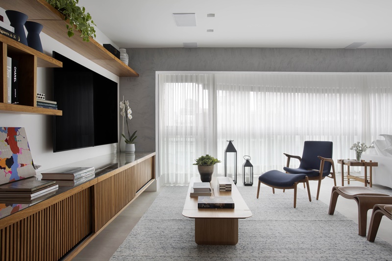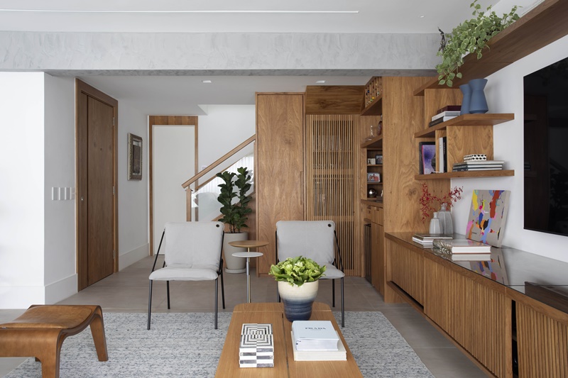 Entre as principais modificações na planta do imóvel, como a sala era muito estreita e comprida, a arquiteta eliminou a varanda para aumentá-la, criando ambientes de estar e tv maiores e mais integrados, com circulação mais fluida. Ainda na sala, havia um quartinho com função de louceiro que escondia a escada e estreitava o hall de entrada e foi eliminado. “Desenhei a estante de forma que se integrasse à escada, com um guarda-corpo de vidro, e criei um armário para equipamentos de rede lógica, embaixo dela“, explica Zaccaro. “Outro destaque na sala são as vigas e os pilares existentes, que foram descascados para deixar o cimento aparente, tratado com textura feita na própria obra“, acrescenta ela.