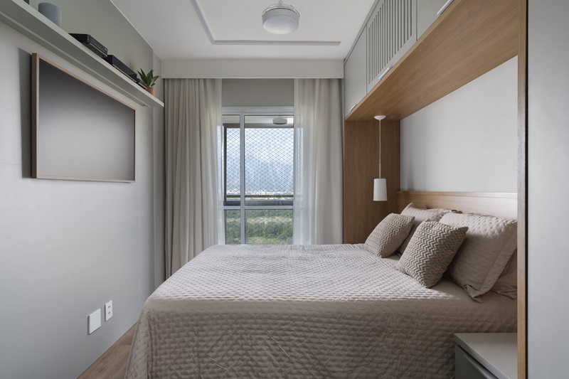 A proposta inicial do cliente era um projeto elegante e duradouro, valorizando texturas nobres. Para atingir esse objetivo, a arquiteta escolheu uma paleta de cores neutra, que amplia o ambiente, e adicionou materiais como a madeira de peroba-rosa e a pedra moledo, trazendo calor e aconchego. A personalização do espaço foi reforçada pelo uso de fotografias de paisagens do acervo pessoal do proprietário, tornando o lar ainda mais único.