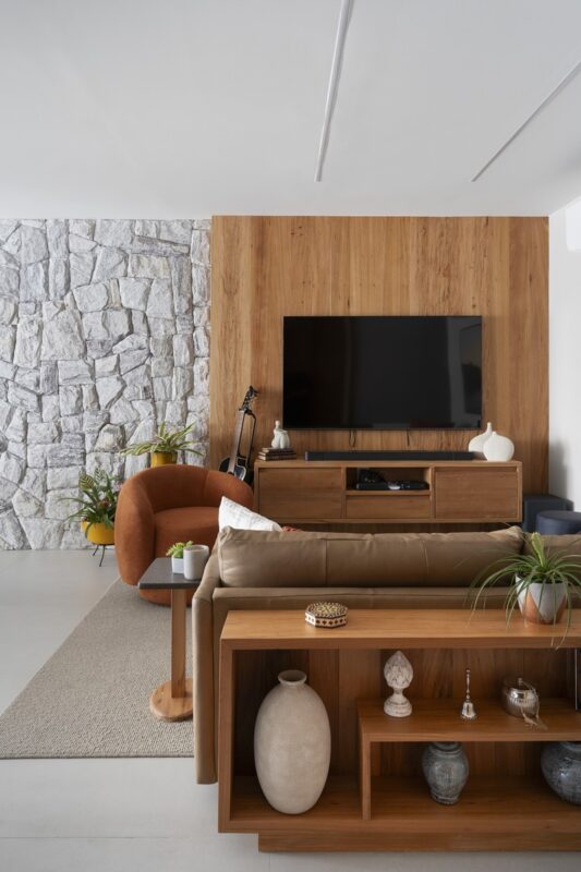 “A história deste projeto é sobre resgatar a essência da natureza sem abrir mão da sofisticação da vida contemporânea”, explica a arquiteta Julia Santana. “O contraste entre a solidez da pedra e as linhas limpas do design contemporâneo cria um equilíbrio perfeito, aquecendo o ambiente e garantindo que o espaço seja prático, confortável e, acima de tudo, atemporal.”