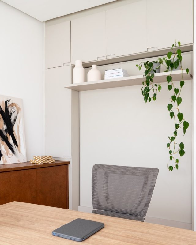 O escritório, ponto central para o trabalho dos moradores, precisava de uma cama para receber hóspedes. Então, foi feita uma marcenaria em que a cama fica embutida no armário.