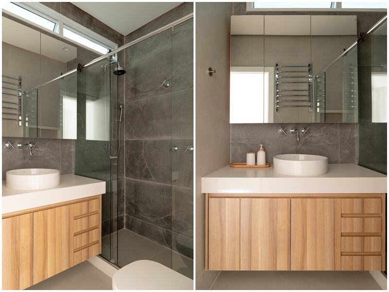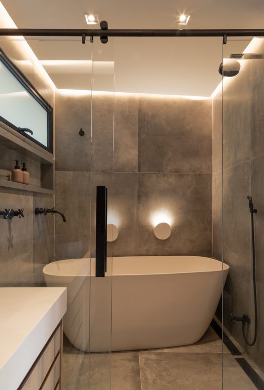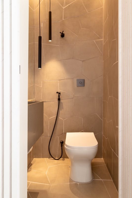 Morando a poucas quadras da praia, Pablo tem paixão por futevôlei e, por isso, a reforma foi pensada desde a área de serviço. “Planejamos um ponto de água e esgoto que serve tanto para os moradores lavarem os pés ao voltar da praia, quanto para o banheiro inteligente da cadelinha. Há uma ducha higiênica com saída da água diretamente para o ralo, facilitando a manutenção e higiene”, detalha Mariana.