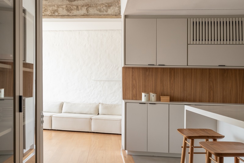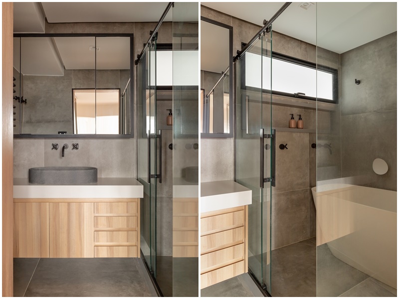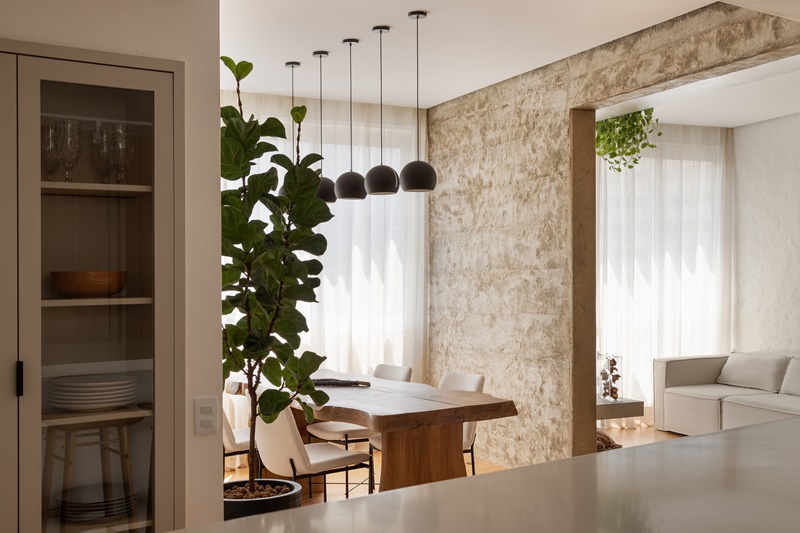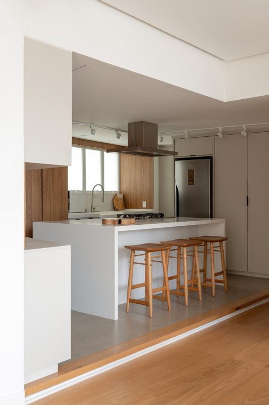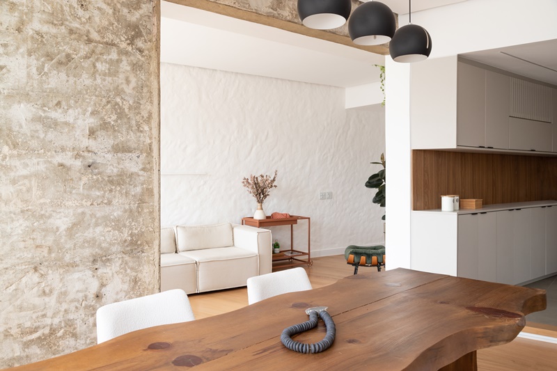 “Os clientes têm um excelente senso estético e afinidade de estilo e buscavam um projeto atemporal. Valorizamos as vigas e paredes de concreto (tirando o reboco), além de utilizar diversas texturas e cores claras para manter o ambiente iluminado e clean.”
