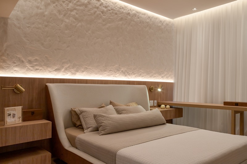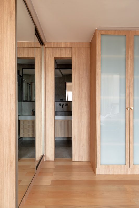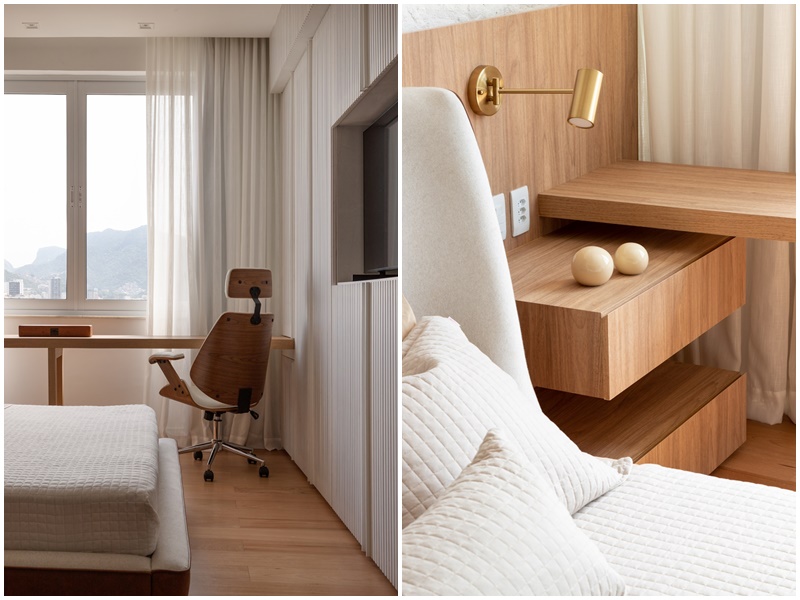 O quarto do casal foi ampliado para incluir um closet, enquanto ajustes na angulação da parede foram feitos para a instalação da sapateira, que ficou disfarçada na parede da TV, com brises na marcenaria para a ventilação dos sapatos.