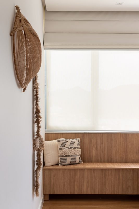 “Para dar a sensação de aconchego, optamos por um piso todo em madeira tauari e a iluminação em pontos específicos, colocando as luminárias de forma secundária e indireta”, conta Mariana.