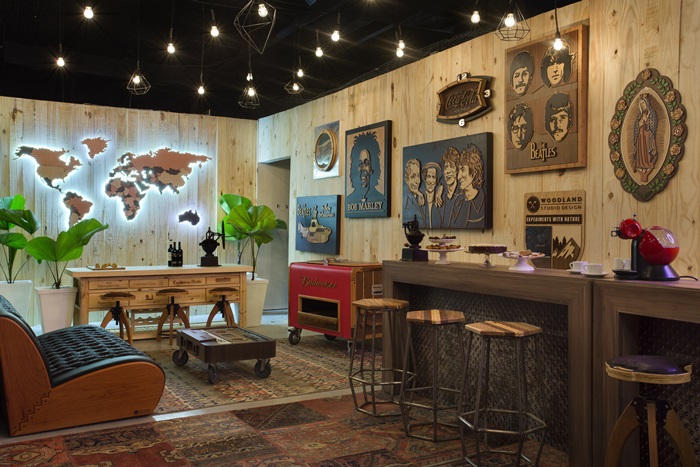 O espaço do Café apresenta uma linguagem descontraída, utilizando peças de design em madeira, além do mobiliário e dos quadros inovadores. As paredes do ambiente serão revestidas em madeira de demolição. A iluminação com fiação aparente é um método barato, descontraído e muito utilizado atualmente.