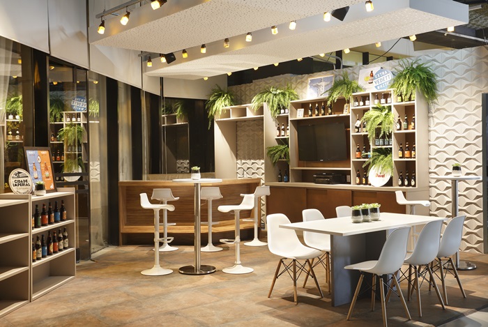 Este espaço foi criado para apresentar um novo conceito em Garrafaria, pensado a partir da cor âmbar das garrafas de cervejas artesanais. Para compor um ambiente agradável de encontro e permanência dos visitantes durante o evento, o mobiliário contemporâneo seguiu tons claros, que conferem leveza à decoração. A irreverência fica por conta das luminárias tipo spot, produzidas a partir de garrafas descartadas.