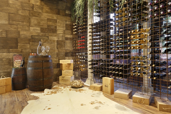 A adega climatizada foi pensada para amantes do vinho que possuem garrafas que estão envelhecendo e aguardando pelo momento ideal para serem degustados. Esses vinhos não só merecem atenção no seu armazenamento como exigem cuidados com a posição, temperatura, umidade e luminosidade. Foram usadas telas de tecon para apoiar os vinhos e a refrigeração com o sistema Inverter diminui o custo de energia em 30%.