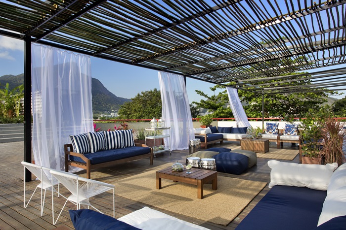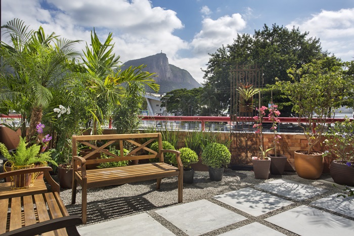 O espaço convida a um passeio por um labirinto de árvores frutíferas, que leva a um lounge aconchegante com terrários, velas, almofadas da cor do mar e vista para a Lagoa Rodrigo de Freitas.