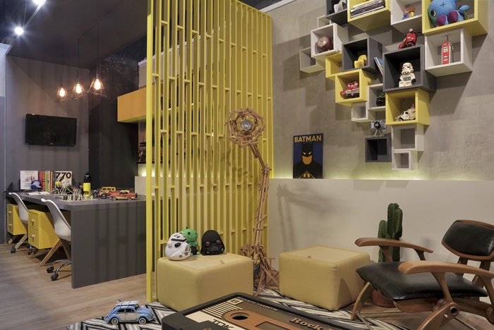 O Estúdio apresenta o estilo industrial, mesclado a uma pegada mais jovem e colorida em seus detalhes. O ambiente foi projetado para ser funcional, integrado a um espaço para a descontração onde os artistas poderão ter seu momento de distração e interação.