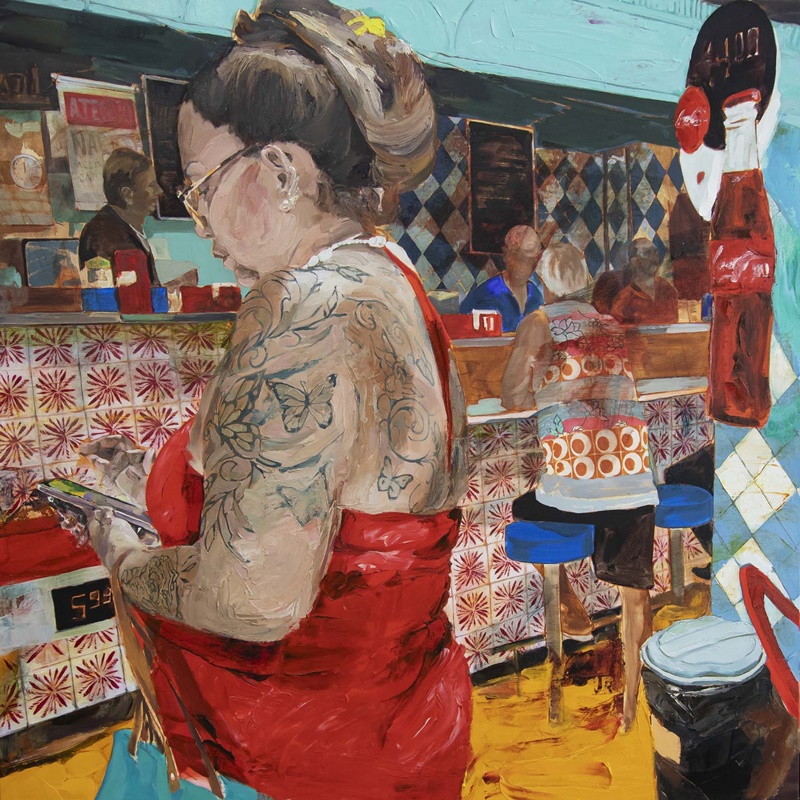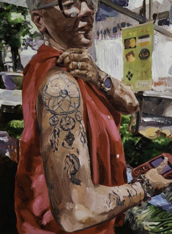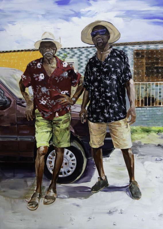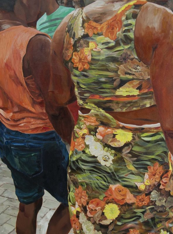 Com as fotografias em mãos, chega a etapa de ir para o ateliê e iniciar a pintura. Nesta série, a artista optou por ser totalmente fiel às estampas que vê, pintando-as exatamente da forma como encontrou nas ruas, mas acrescentando elementos aos trabalhos, criando novos cenários, não seguindo fielmente a fotografia. “Não quero que a pintura seja só uma reprodução fotográfica, por isso misturo os corpos, os lugares. Para que a pintura funcione, preciso escolher a relação entre figura e fundo”, conta.