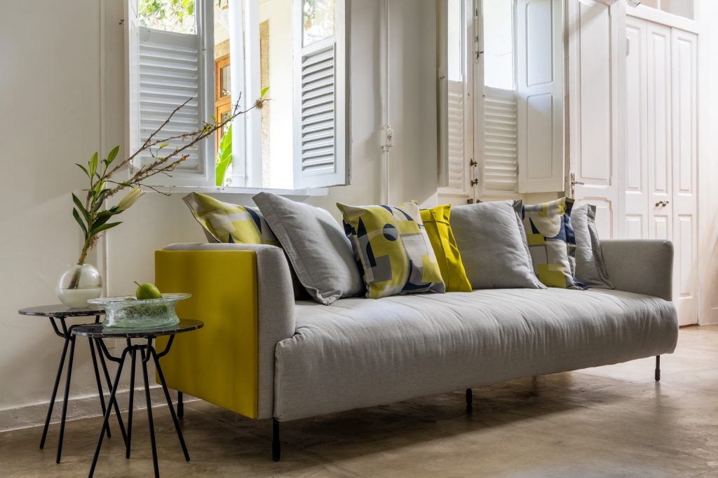 Já seus braços tem forma orgânica na parte interna, sendo convidativo para sentar. O conforto é completado com as almofadas de encosto soltas e macias, recheadas com pluma. São duas versões – sofá e recamier – podem ser utilizados com um generoso puff. Perfeito para uma sessão de cinema em casa.