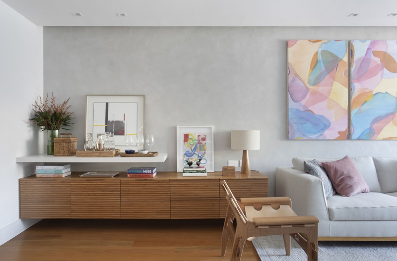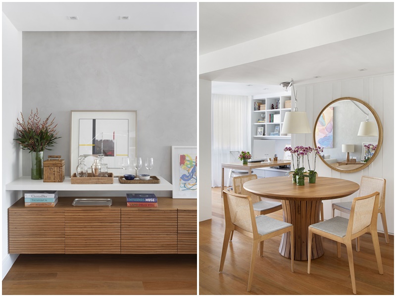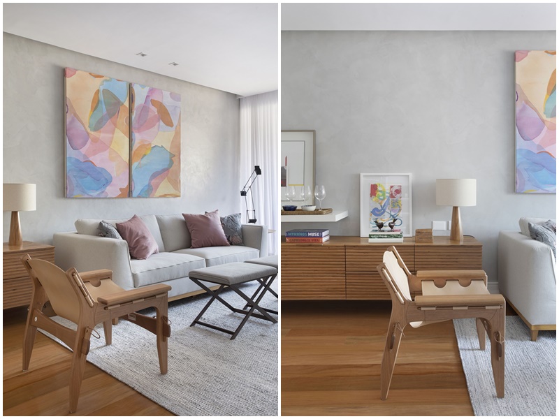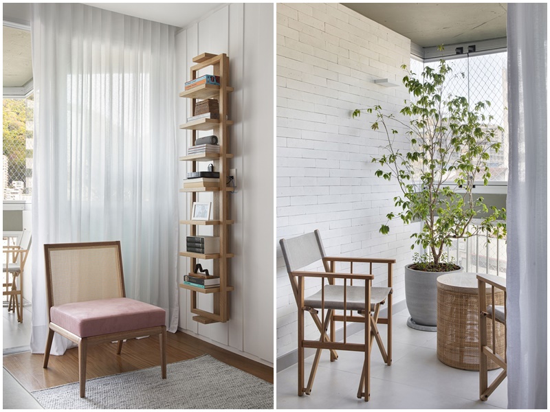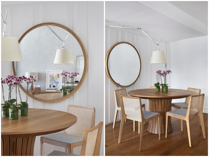 Na área social, a paleta de cores predominantemente em tons claros e suaves (com toques de rosa e rosé) se mistura a materiais naturais. A madeira, por exemplo, está presente no piso de tábua corrida, em quase todos os móveis e na marcenaria. Já a palhinha aparece no encosto das cadeiras e da poltrona e na mesa de apoio de formato cilíndrico da varanda. Por causa do formato estreito da sala, as arquitetas priorizaram móveis com medidas proporcionais ao espaço para não comprometer a circulação. Pelo mesmo motivo, elas optaram por fixar a tv diretamente na parede forrada de lambri e acomodaram os equipamentos junto com livros nas prateleiras de uma estante de parede estreita, fixada na lateral. “Também para driblar a falta de espaço, no lugar da tradicional mesa de centro, usamos duas banquetas com assento estofado e pés em X de metal“, revela Cecília. No quesito mobiliário brasileiro de design assinado, as arquitetas destacam a poltrona Killin com assento de couro (de Sergio Rodrigues) na sala de estar e as cadeiras Dia (de Jader Almeida) e mesa Dorio (de Maria Candida Machado) na sala de jantar.